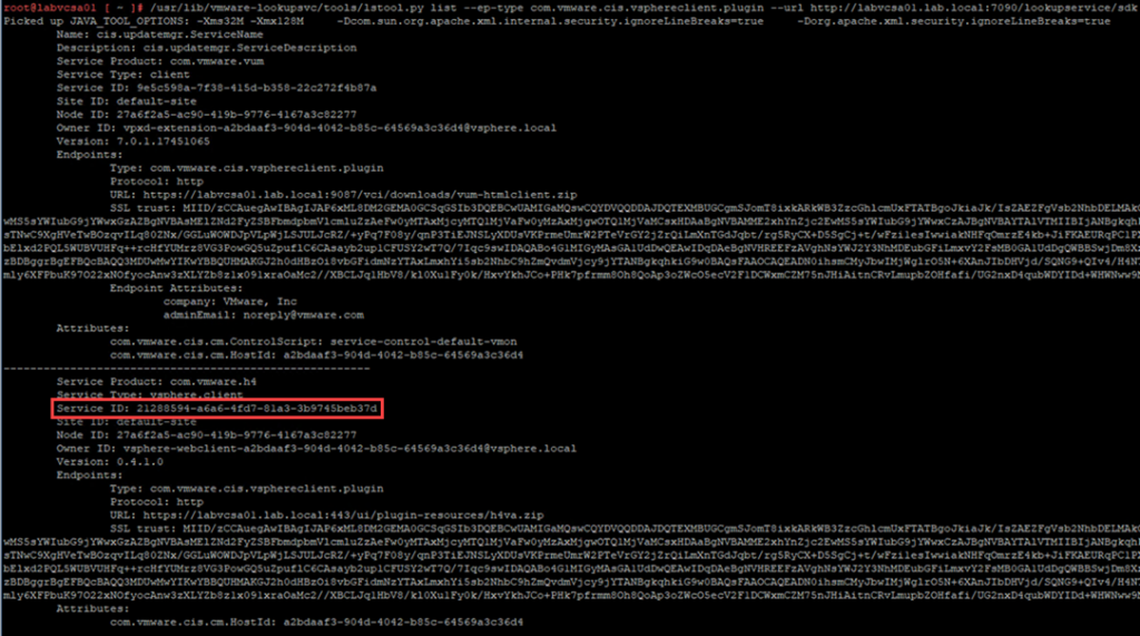 /usr/lib/vmware-lookupsvc/tools/lstool.py list –ep-type com.vmware.cis.vsphereclient.plugin –url http://<YourvCenterFQDN>:7090/lookupservice/sdk