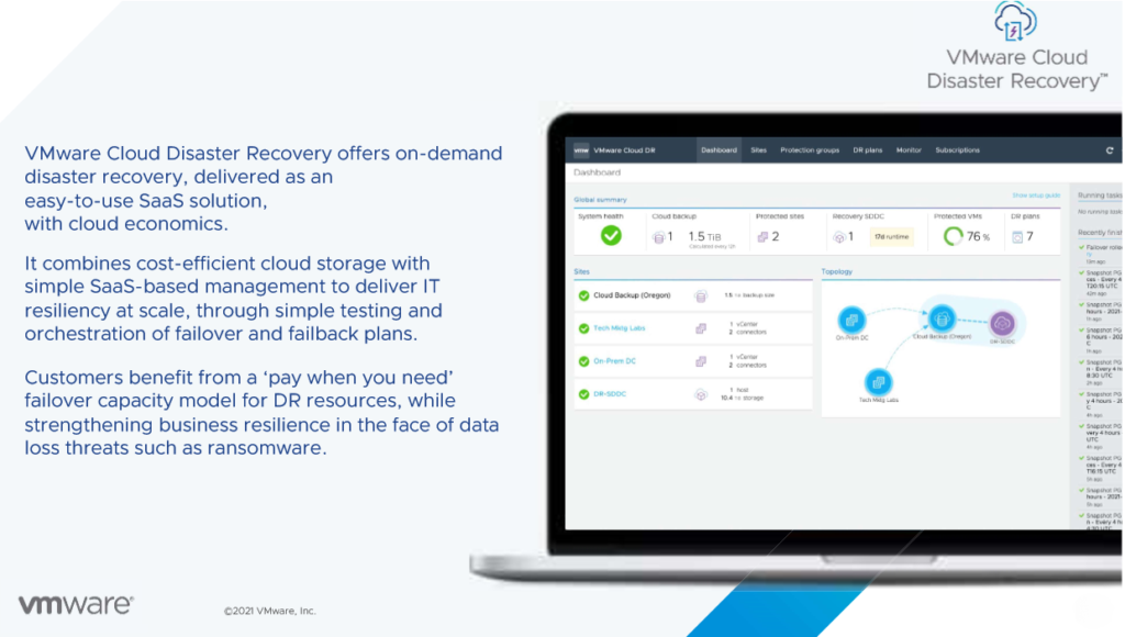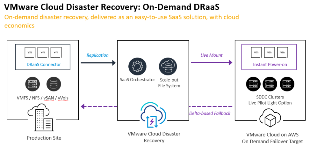 VMware Cloud Disaster Recovery is the new business continuity management solution from VMware which rescue your organization in case of disaster. VMware Cloud Disaster Recovery (VCDR) is Disaster Recovery-as-a-Service (DRaaS). DRaaS is provided through VMware Cloud Services to you. The paradigm « Do not change anything in case of disaster » is fulfilled – your workloads will be running without converting or readdressing on the VMware Cloud on AWS on the disaster site.