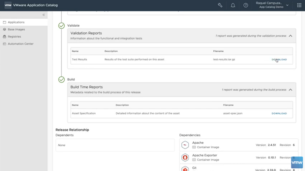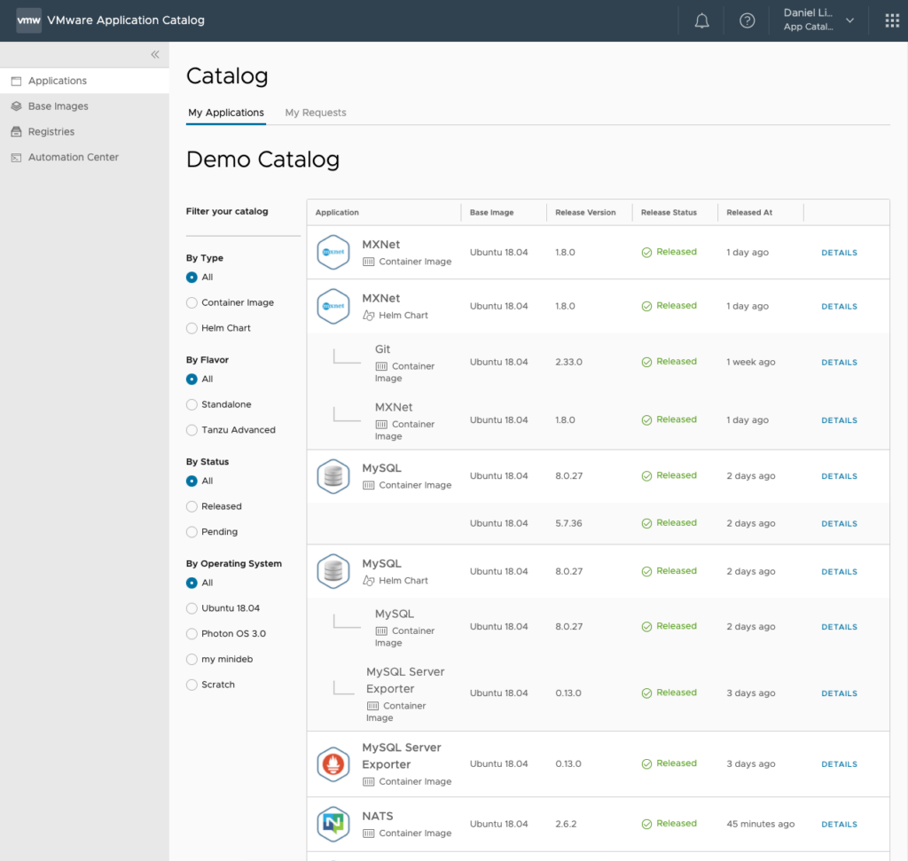 See a live demo on https://tanzu.vmware.com/content/videos/vmware-application-catalog-demo