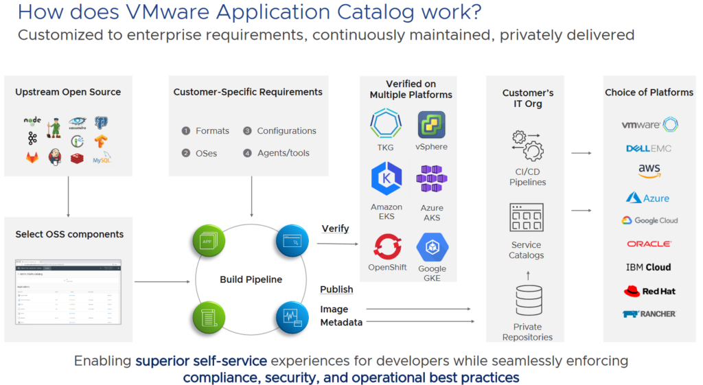 The VMware Application Catalog provides a central repository of trusted, pre-packaged open-source application components that are continuously maintained and verifiably tested for use in production environments. You can build a customized selection of those components and add any available application components to your catalog which are custom build-to-spec on your operating system image of choice and delivered securely to your private registry of choice. The entire software listing is packaged by VMware and the open-source licenses is provided to you on an AS-IS basis. These catalog items can be deployed on any supported Kubernetes platform including VMware Tanzu.